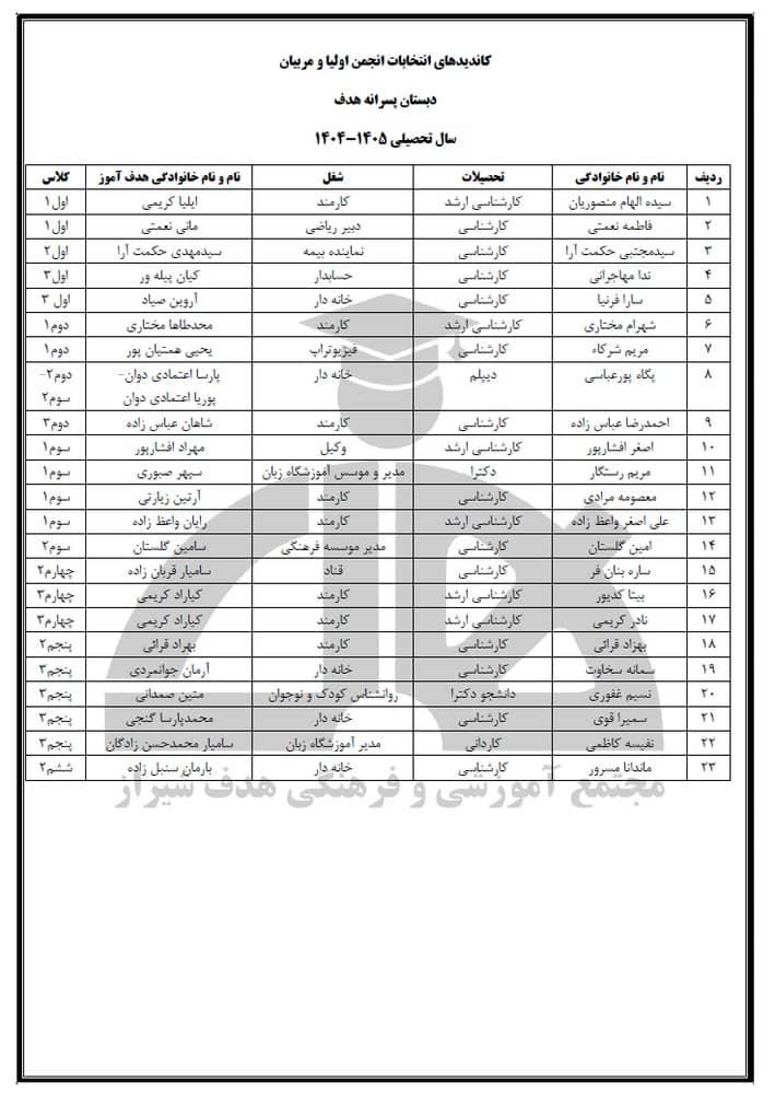 ✅اسامی کاندیداهای انتخابات انجمن اولیا و مربیان به پیوست خدمتتان ارسال می گردد. با توجه به کلیپ های معرفی اعضا و با شناختی که از ایشان کسب کردید ، مراحل زیر را انجام دهید: