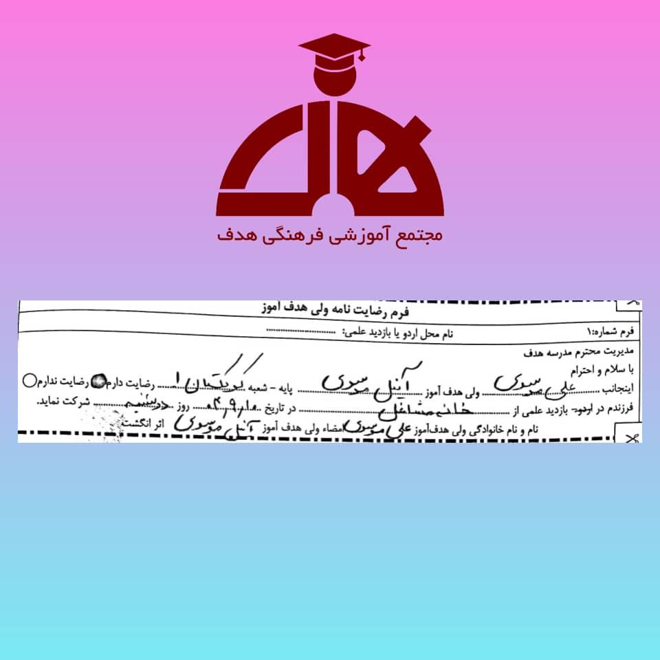 خواهشمندیم رضایت نامه را از صفحه ۳۰ مجله آوای هدف جدا نموده، مانند نمونه تکمیل نمایید، و حداکثر تا روز شنبه مورخ ۸ آذر ماه به مربی کلاس تحویل دهید.