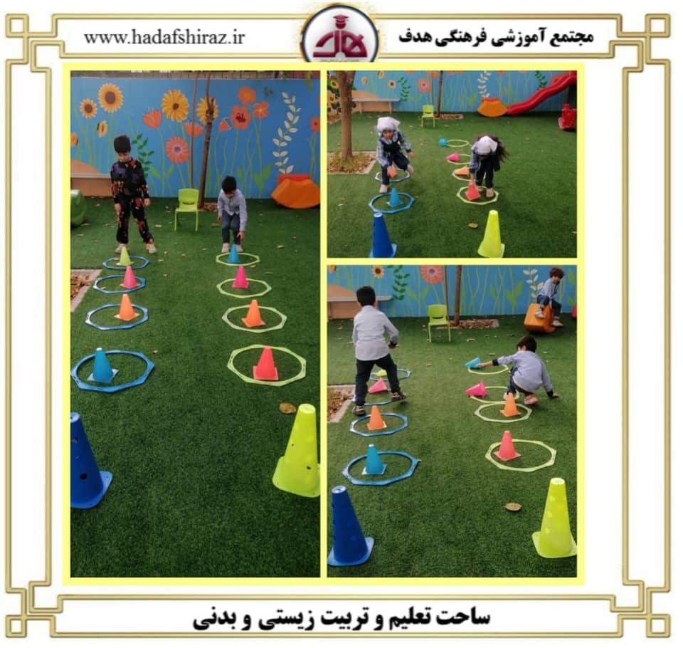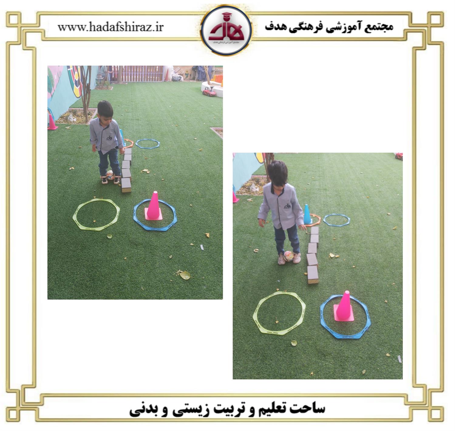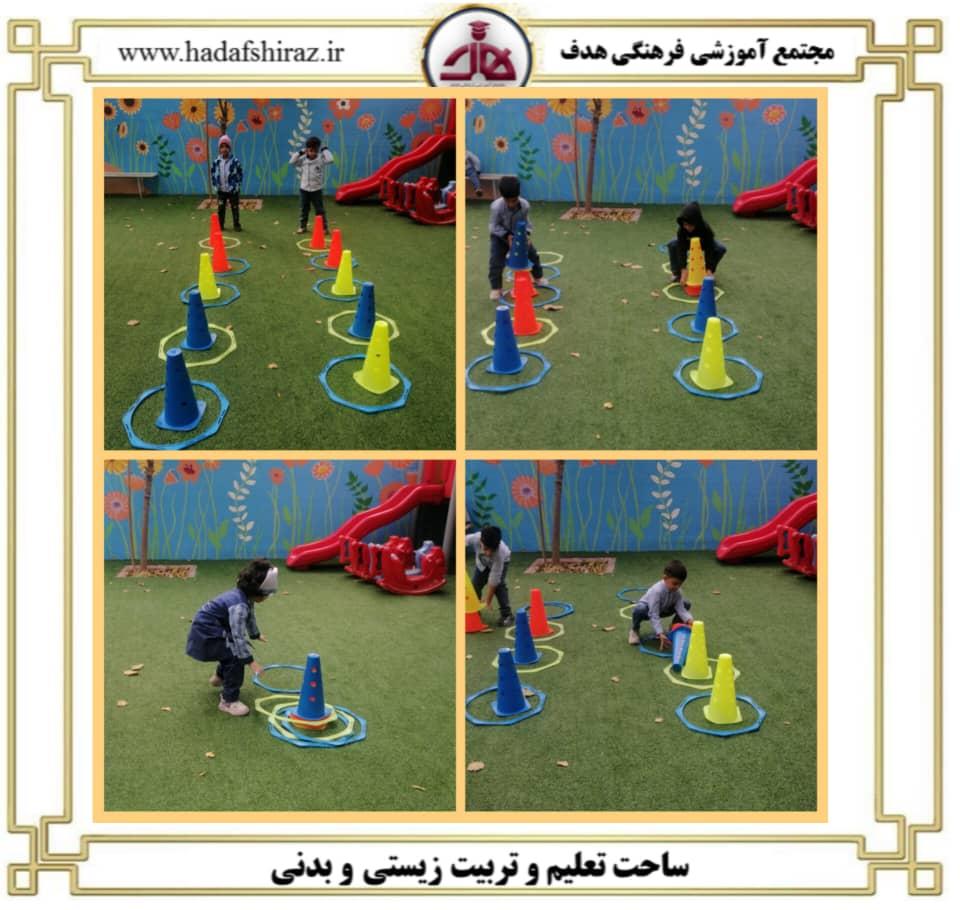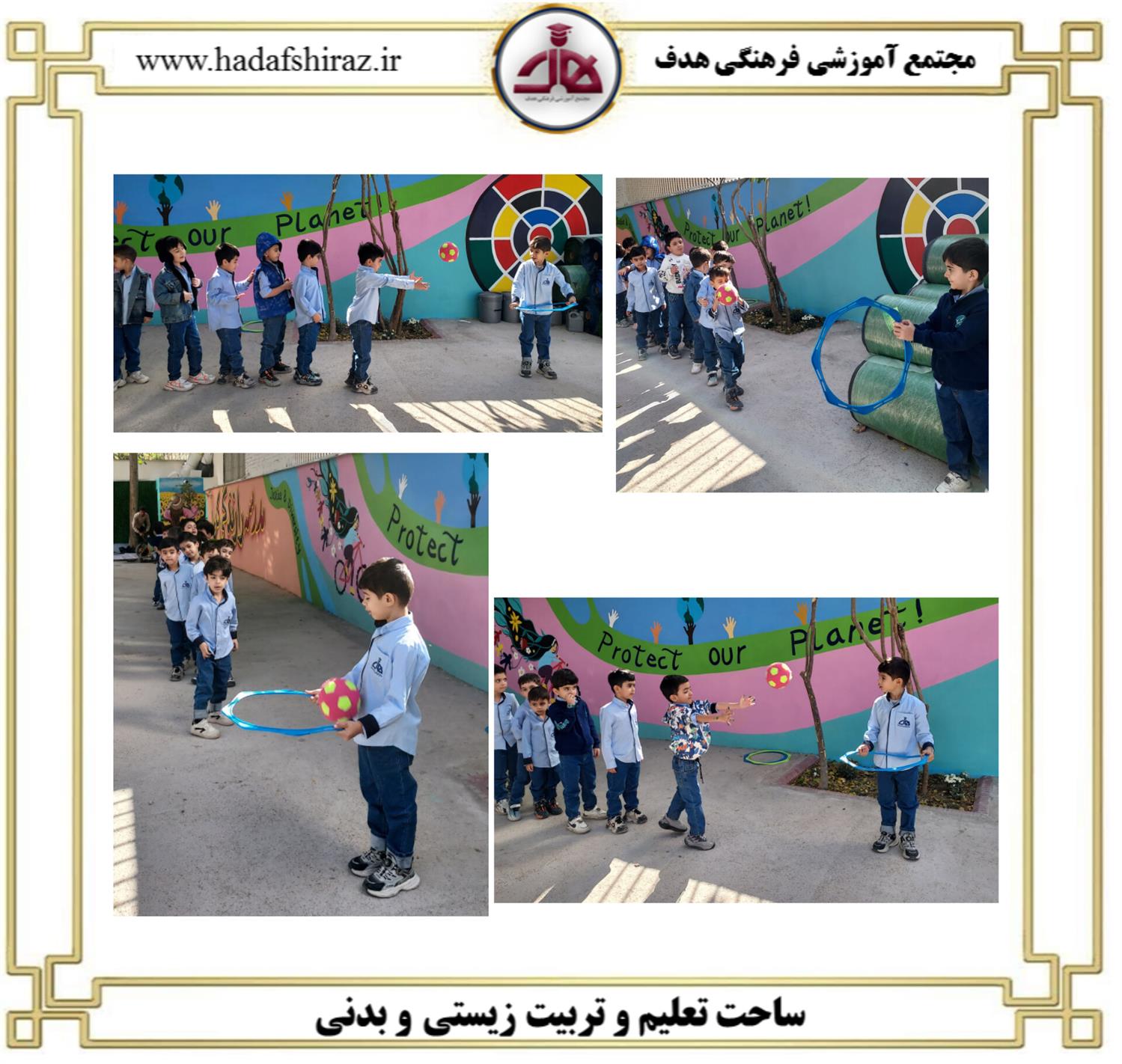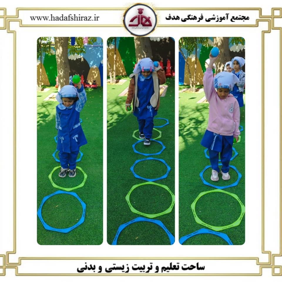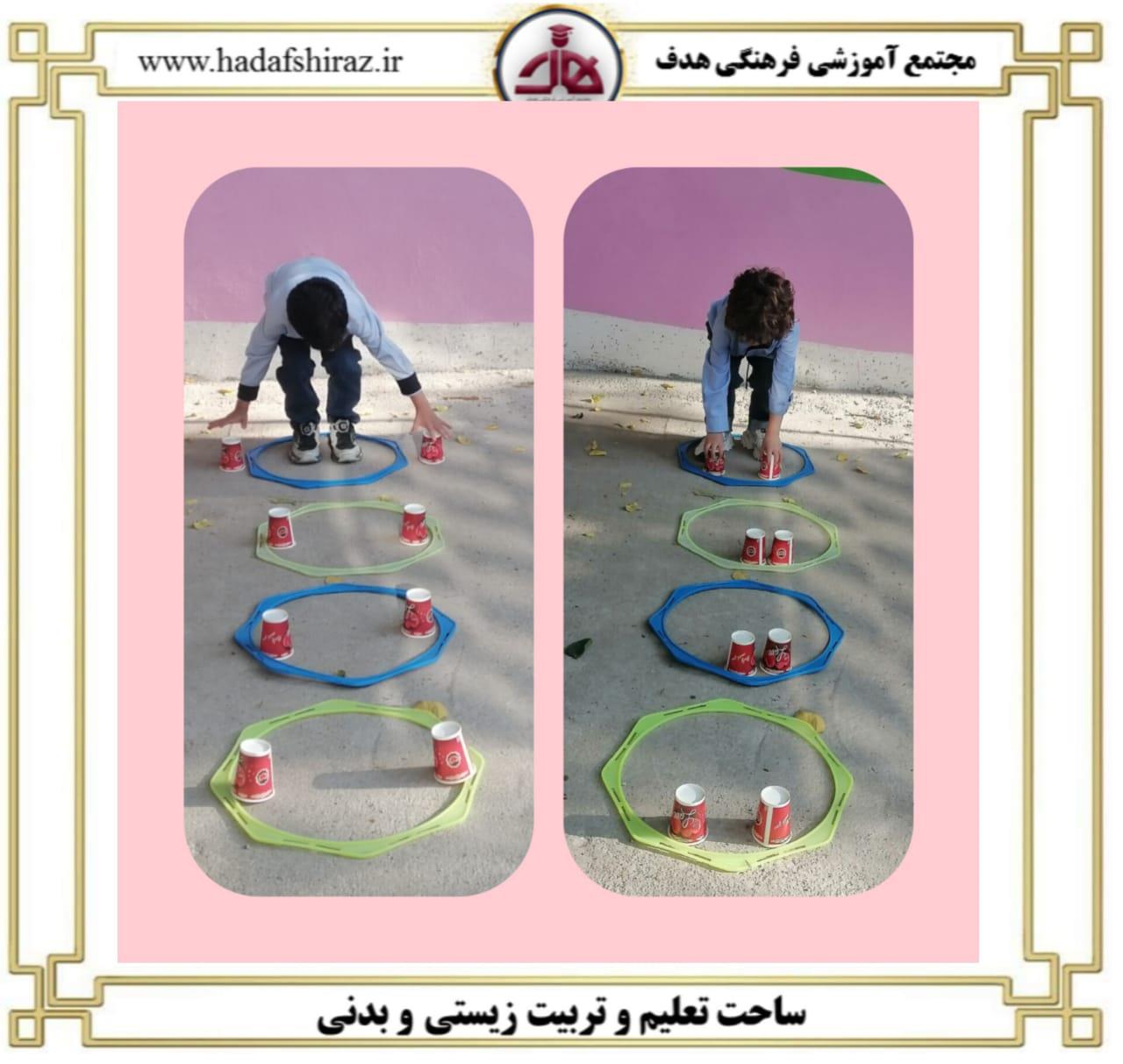 بازی رد شدن از روی موانع و عبور مارپیچ و پریدن در حلقه و پرتاب توپ جهت تقویت عضلات درشت و افزایش هماهنگی اعضای بدن