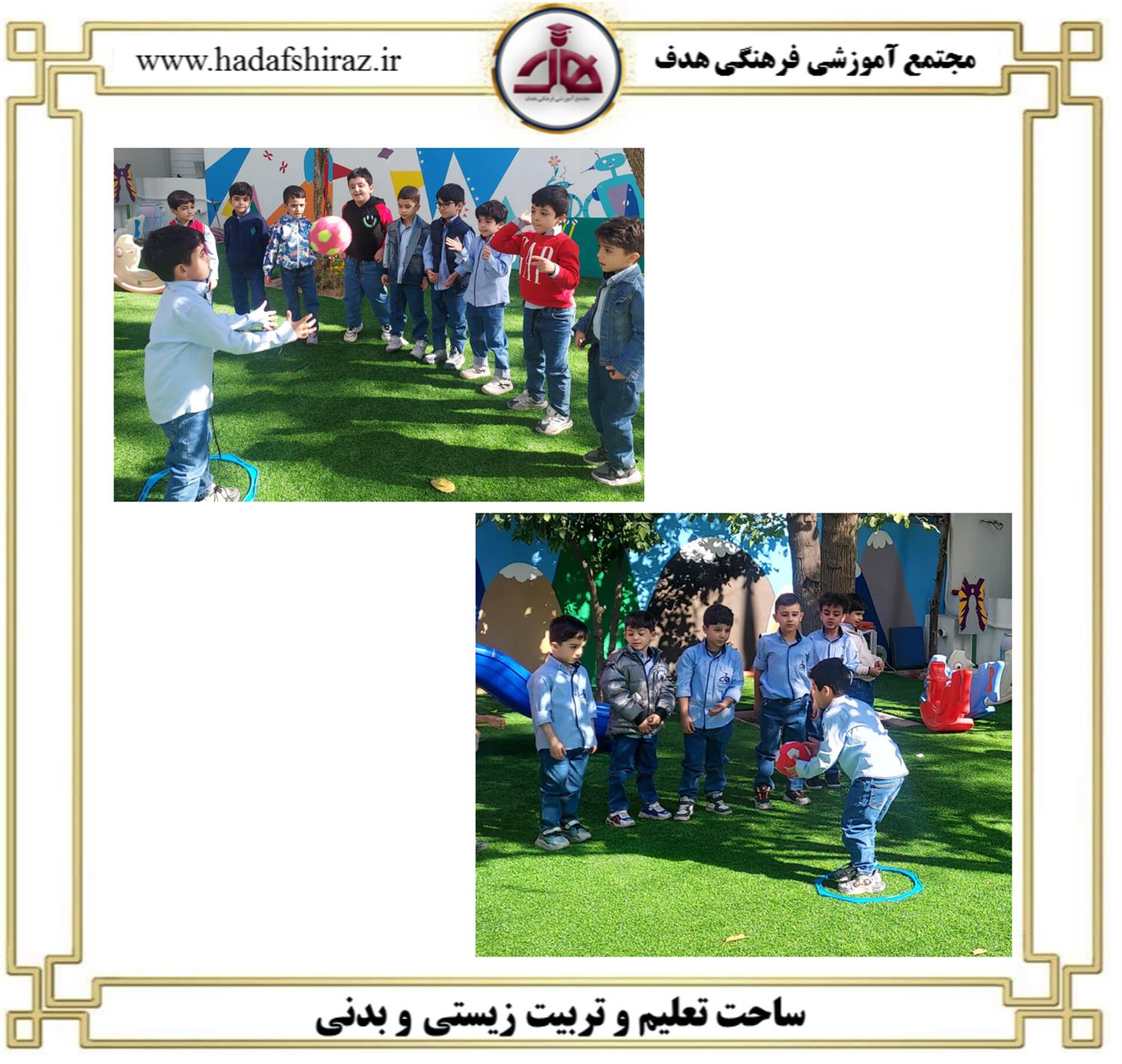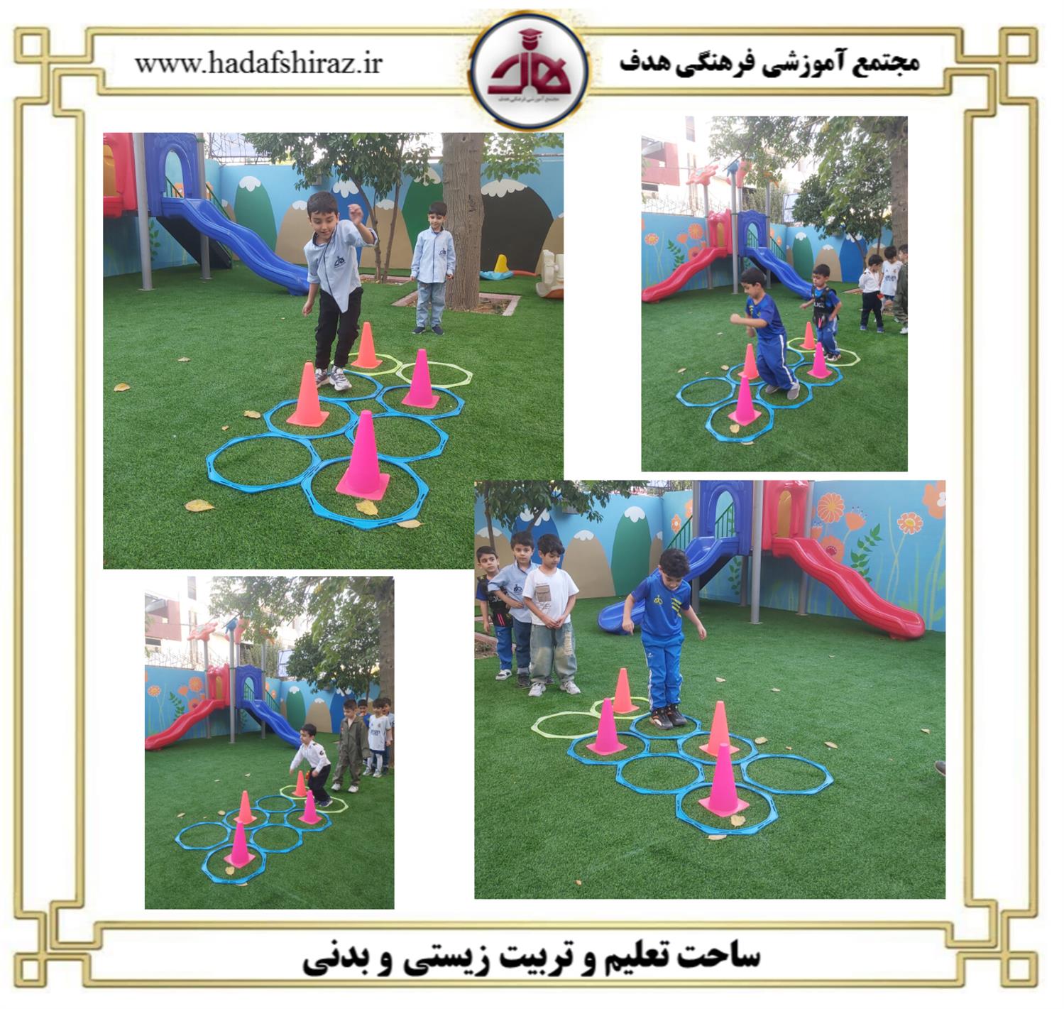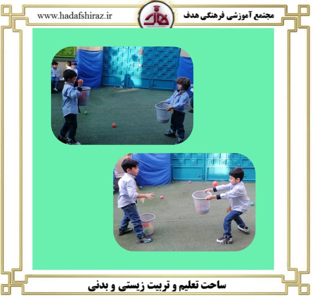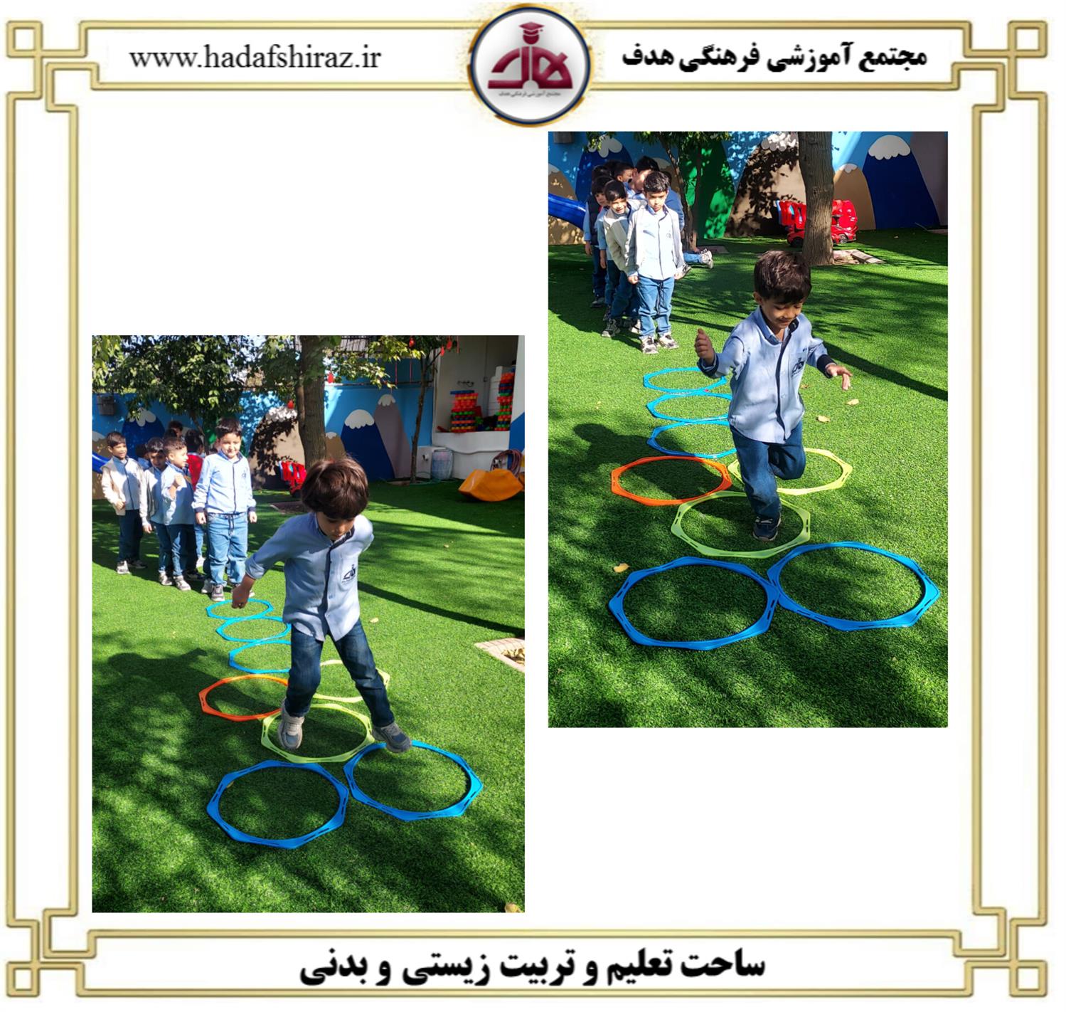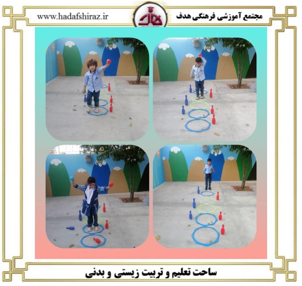 بازی رد شدن از روی موانع و عبور مارپیچ و پریدن در حلقه و پرتاب توپ جهت تقویت عضلات درشت و افزایش هماهنگی اعضای بدن