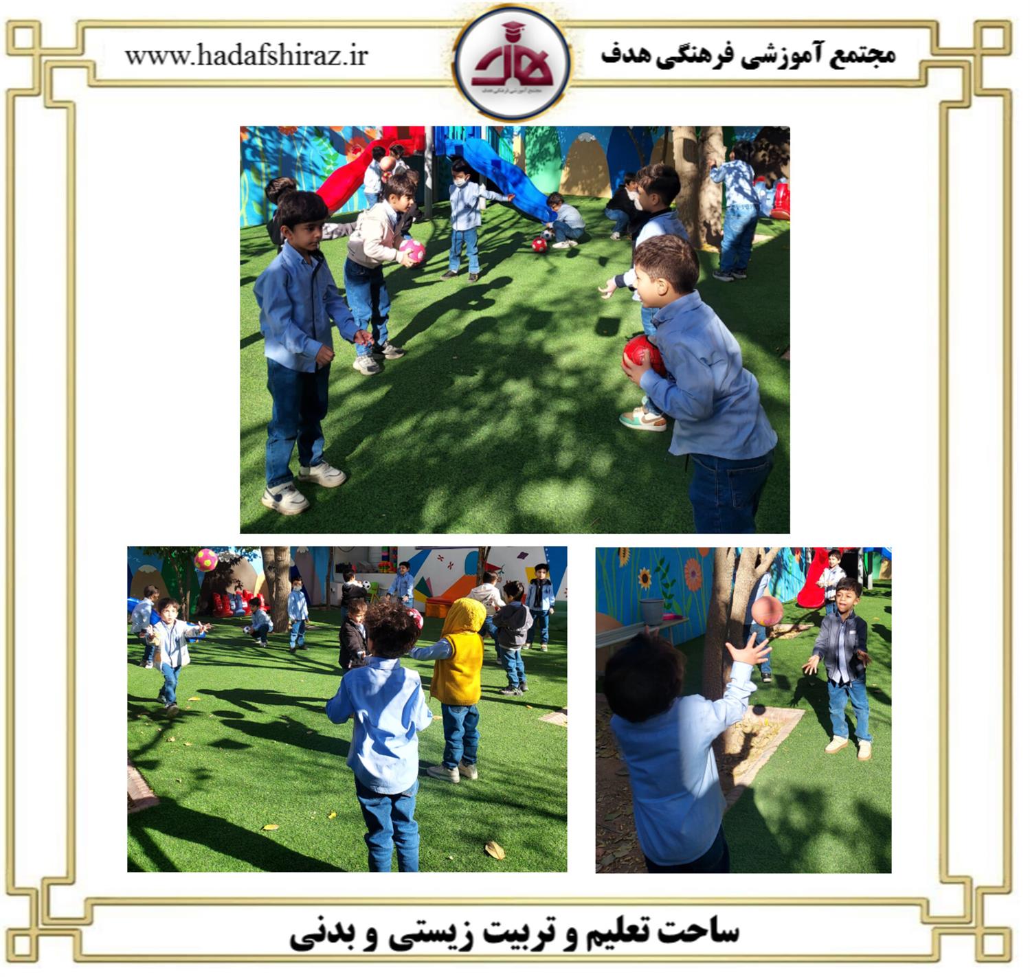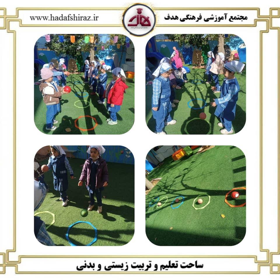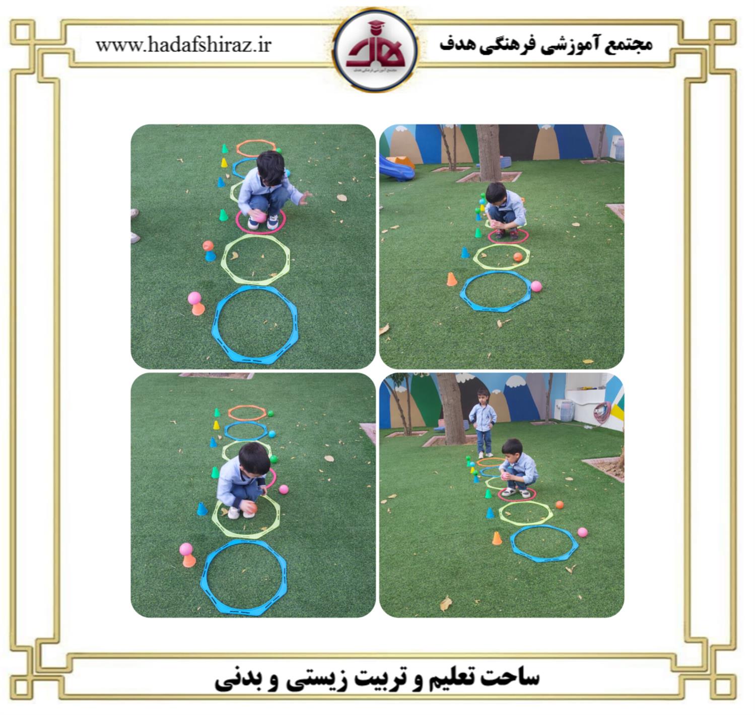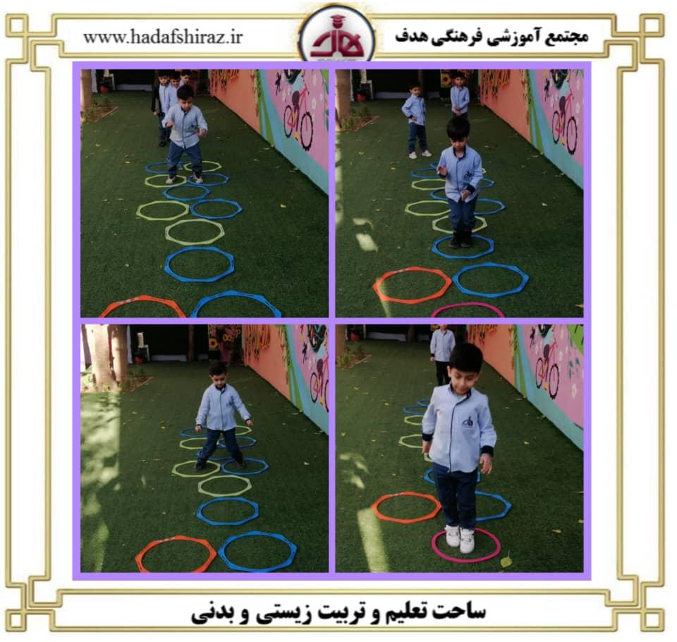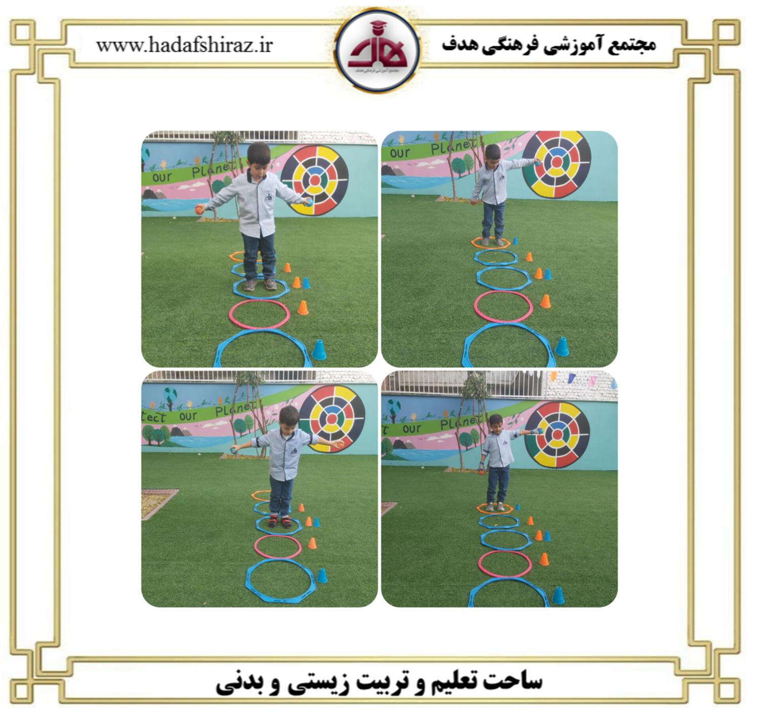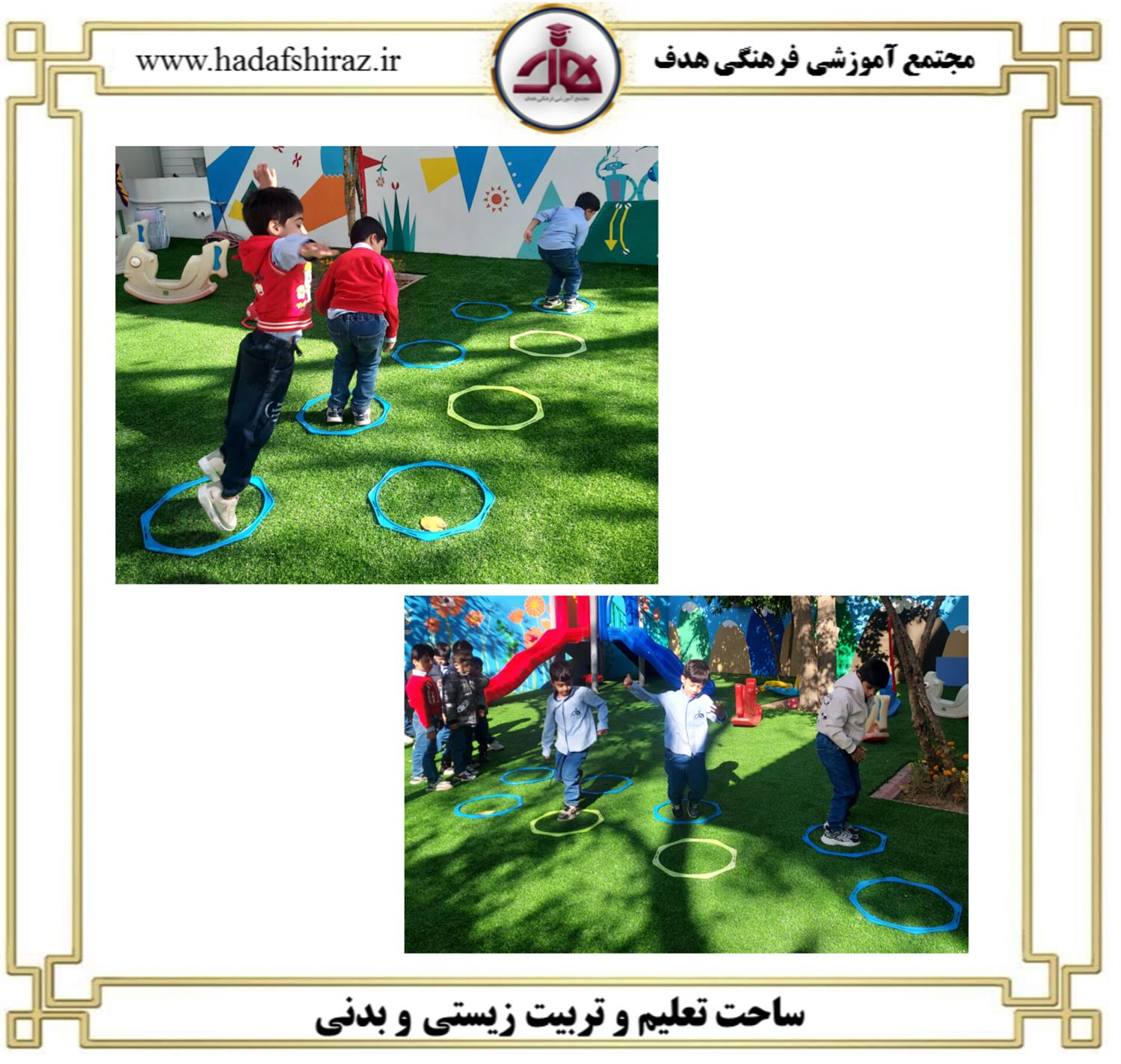 بازی رد شدن از روی موانع و عبور مارپیچ و پریدن در حلقه و پرتاب توپ جهت تقویت عضلات درشت و افزایش هماهنگی اعضای بدن