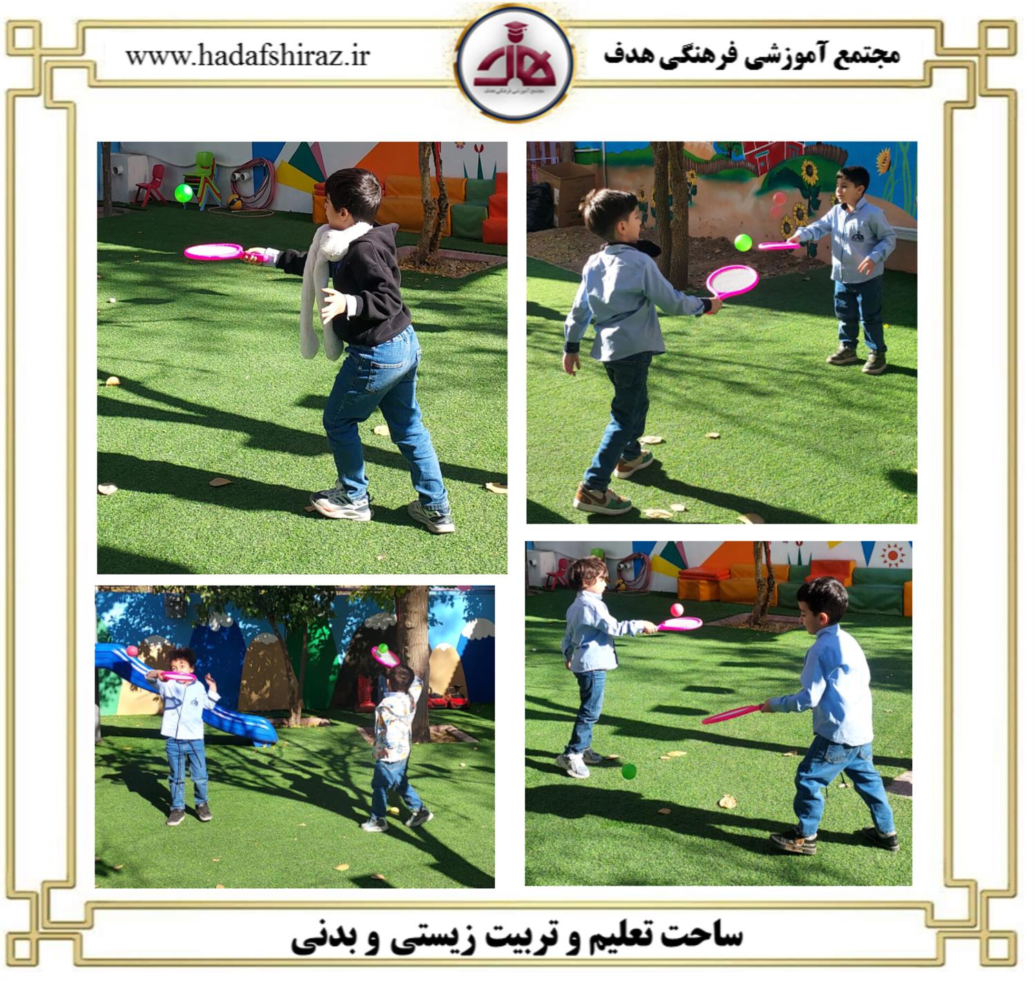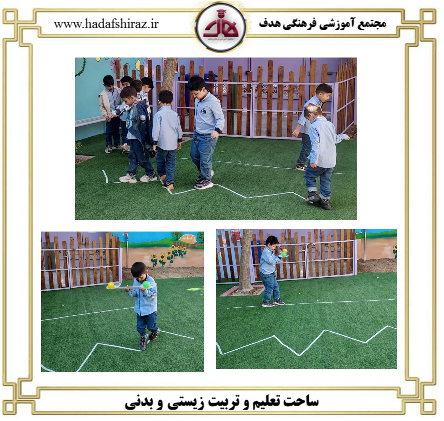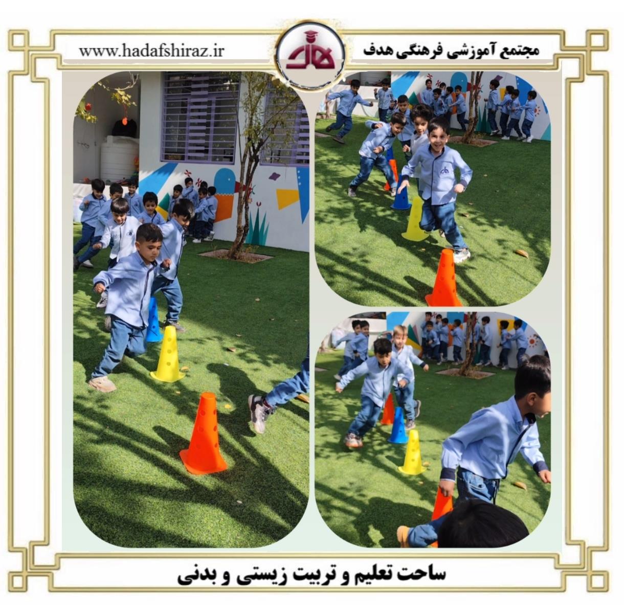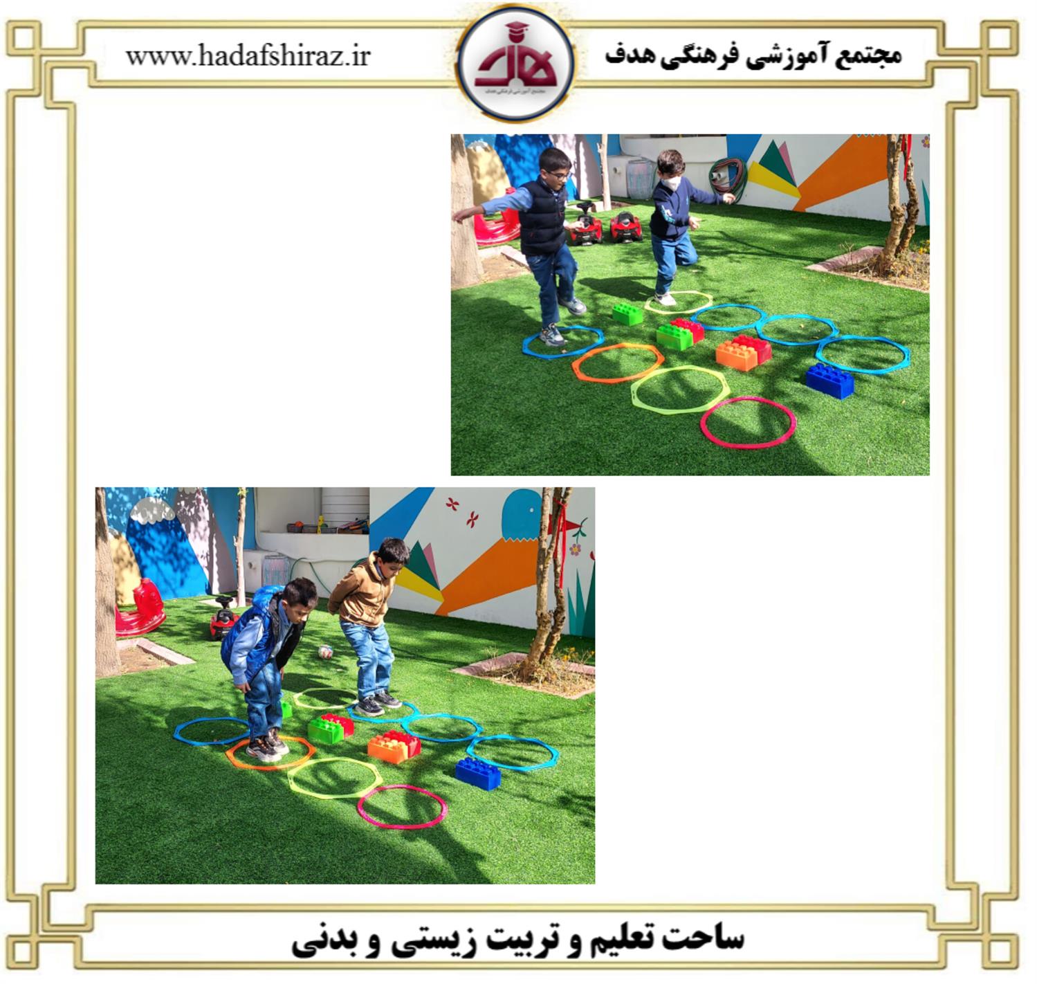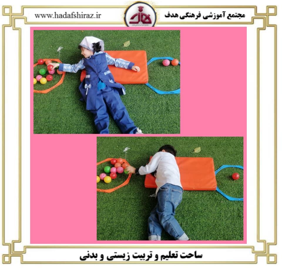 بازی رد شدن از روی موانع و عبور مارپیچ و پریدن در حلقه و پرتاب توپ جهت تقویت عضلات درشت و افزایش هماهنگی اعضای بدن