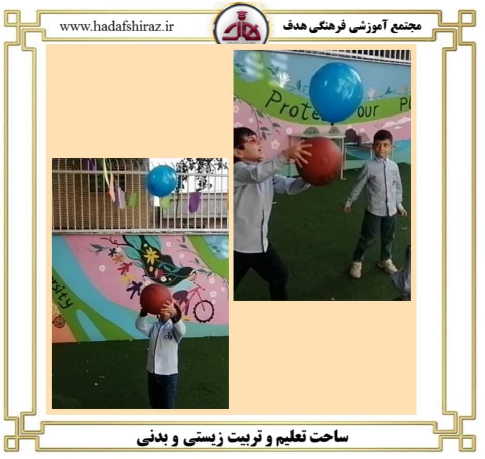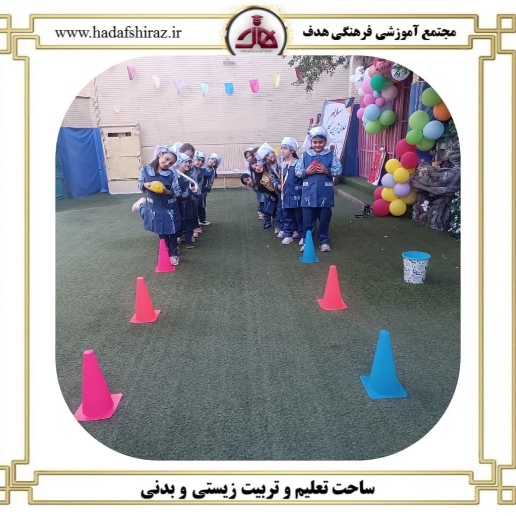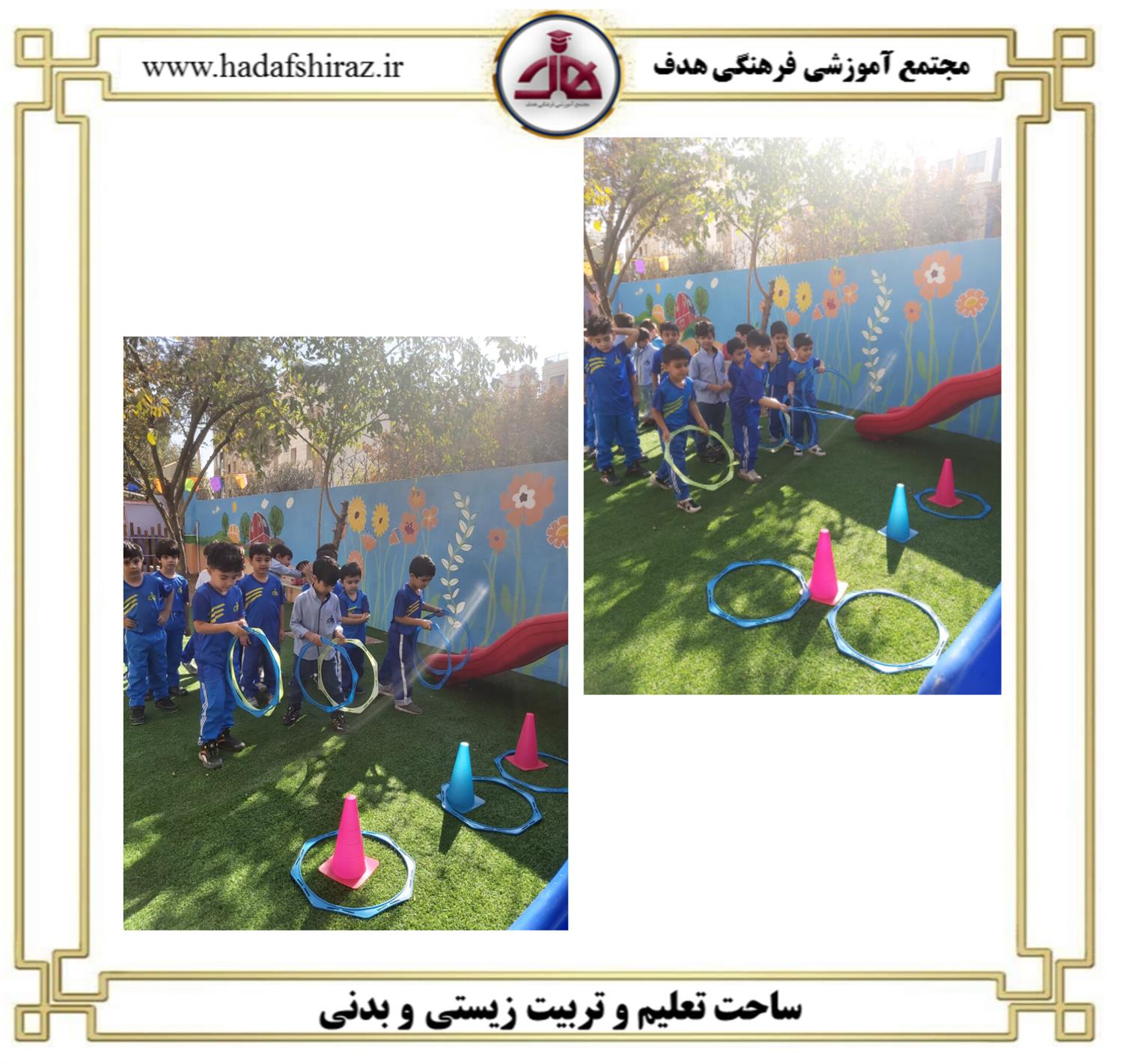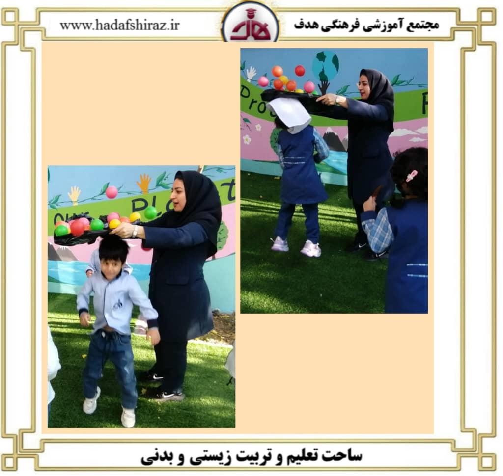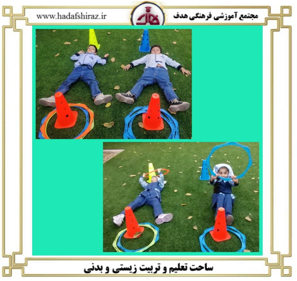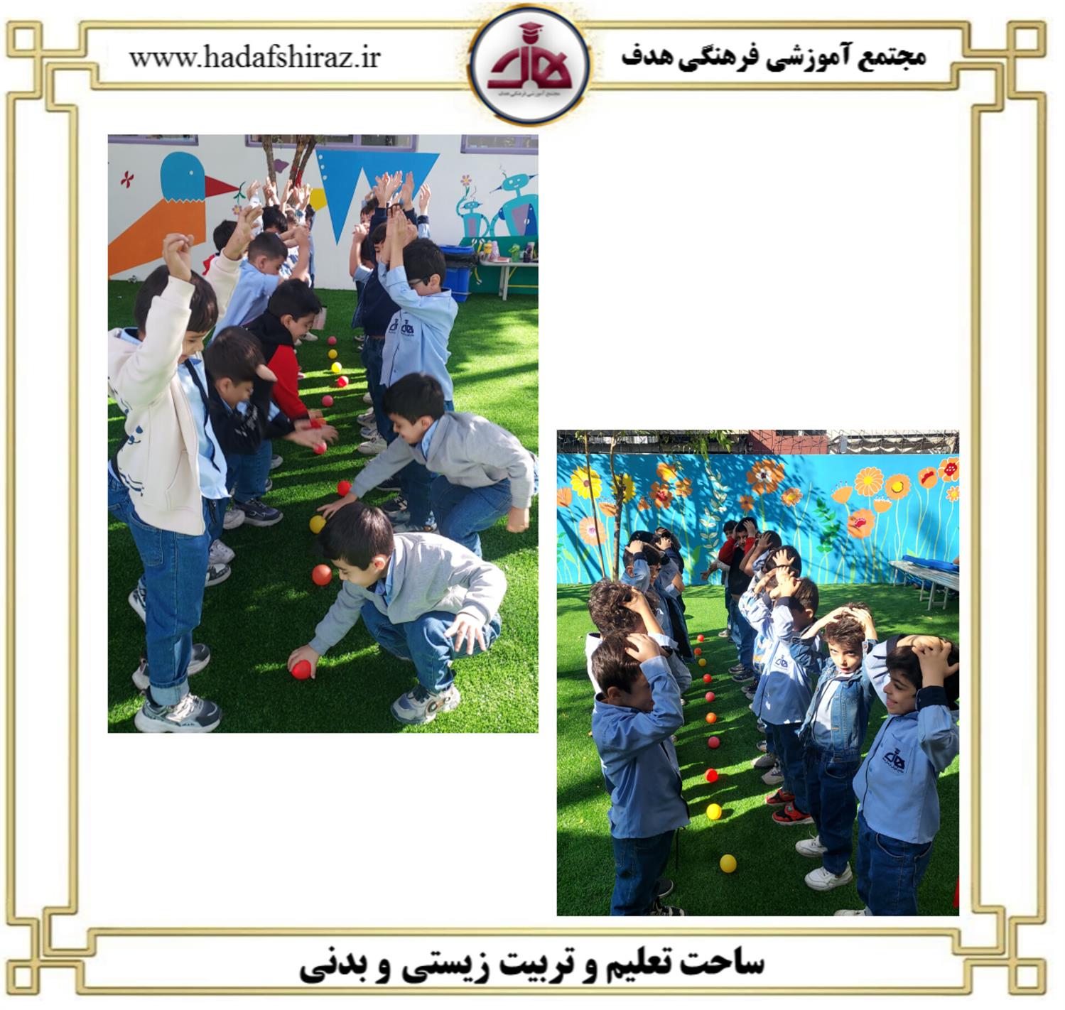 بازی رد شدن از روی موانع و عبور مارپیچ و پریدن در حلقه و پرتاب توپ جهت تقویت عضلات درشت و افزایش هماهنگی اعضای بدن