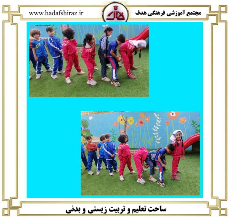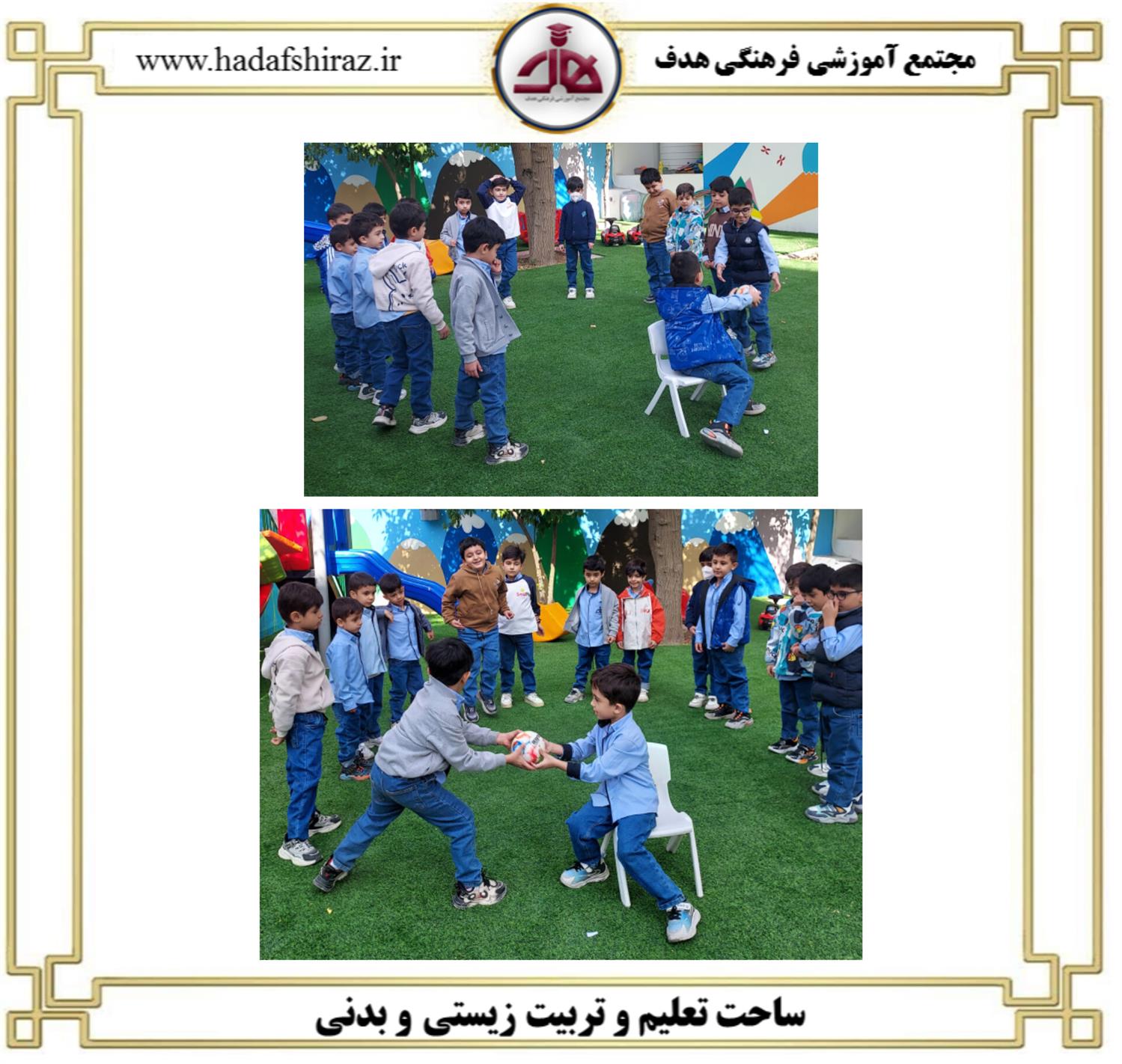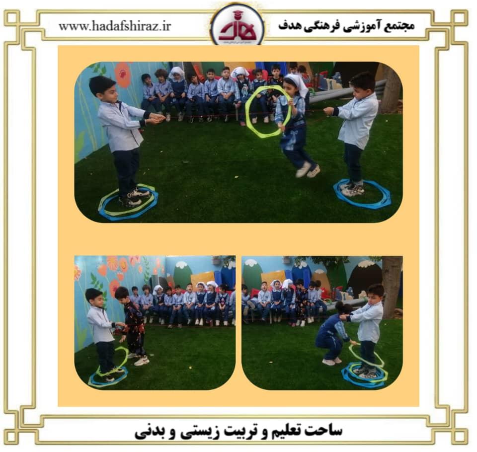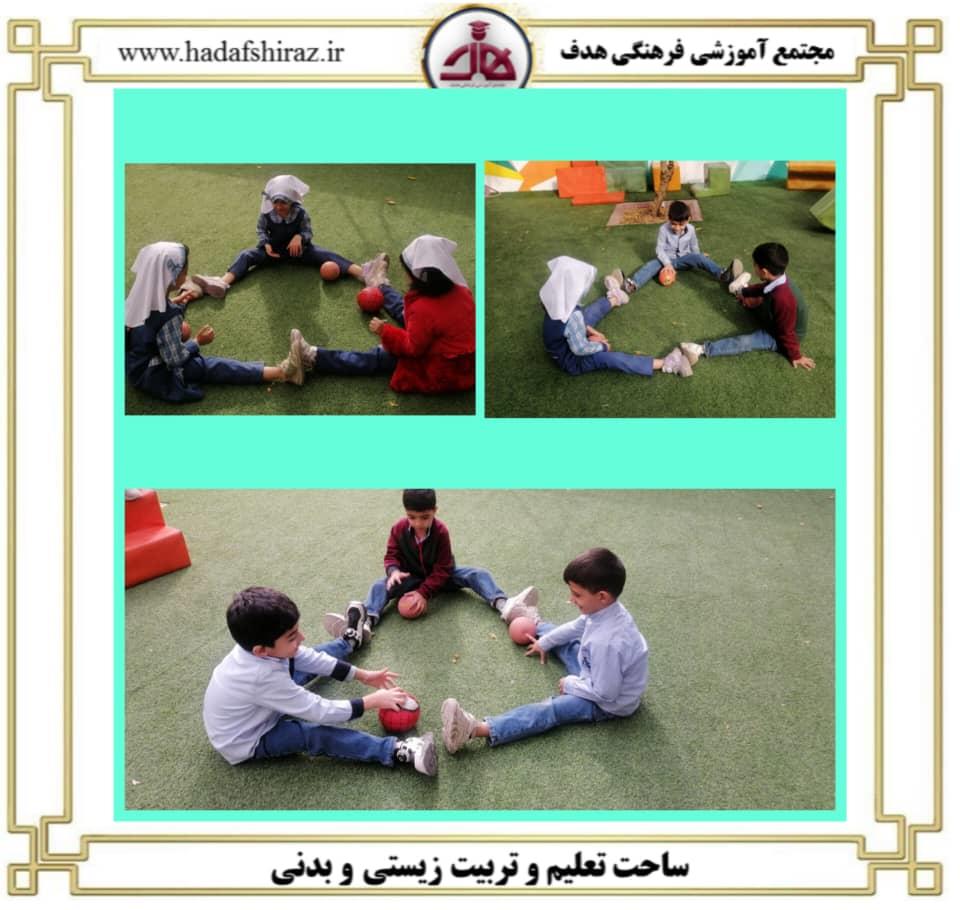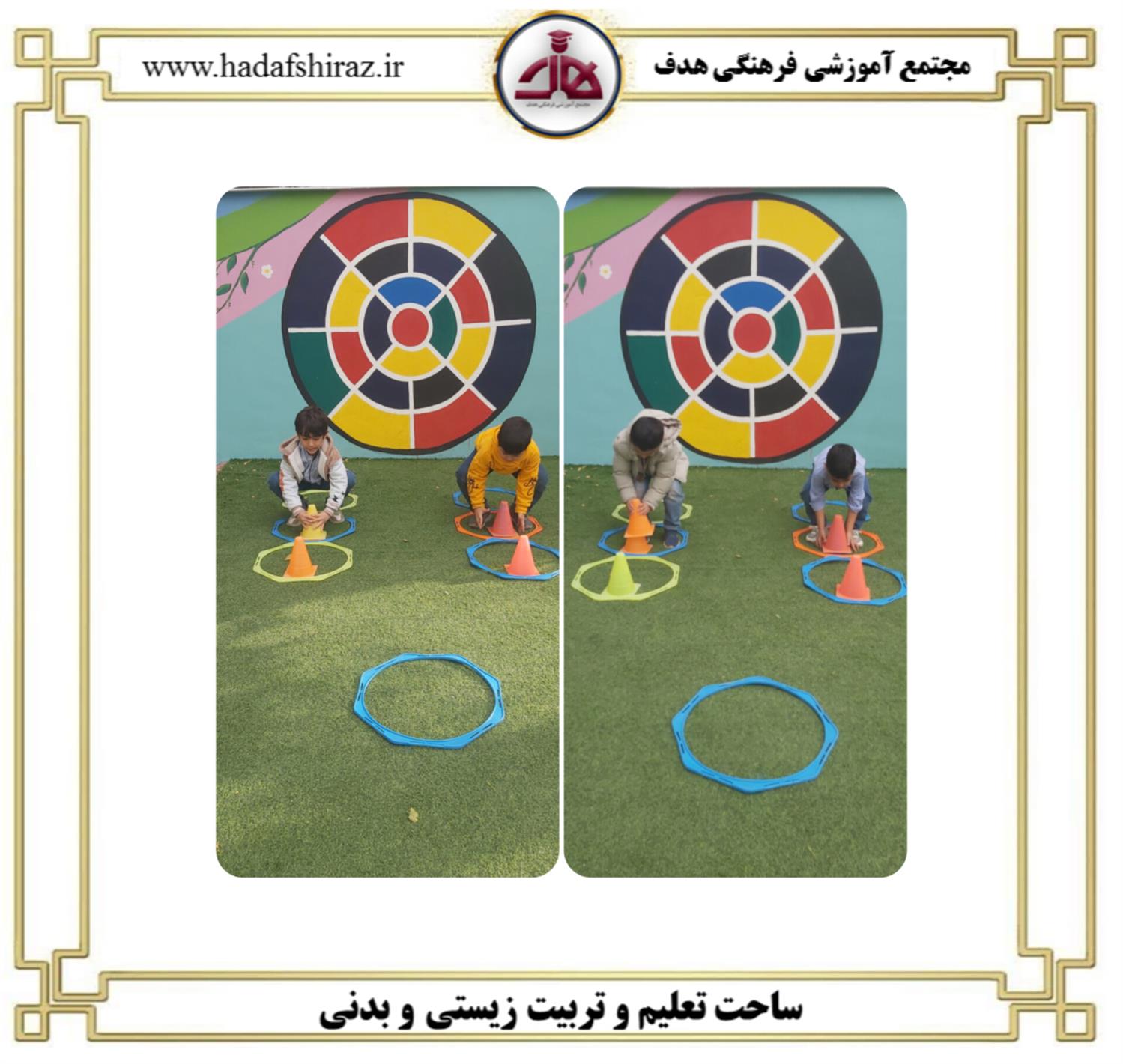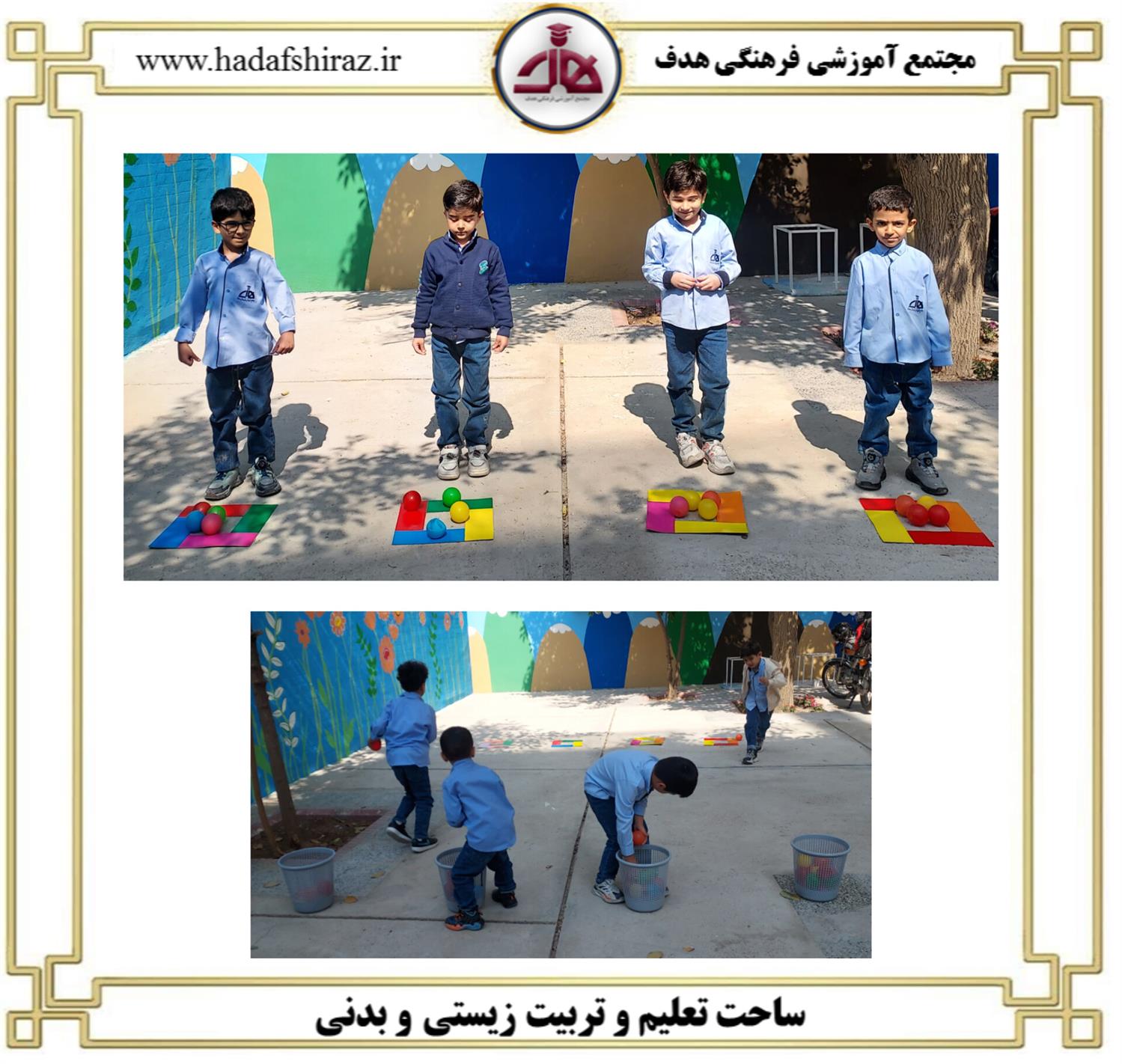 بازی رد شدن از روی موانع و عبور مارپیچ و پریدن در حلقه و پرتاب توپ جهت تقویت عضلات درشت و افزایش هماهنگی اعضای بدن