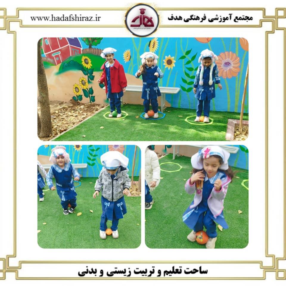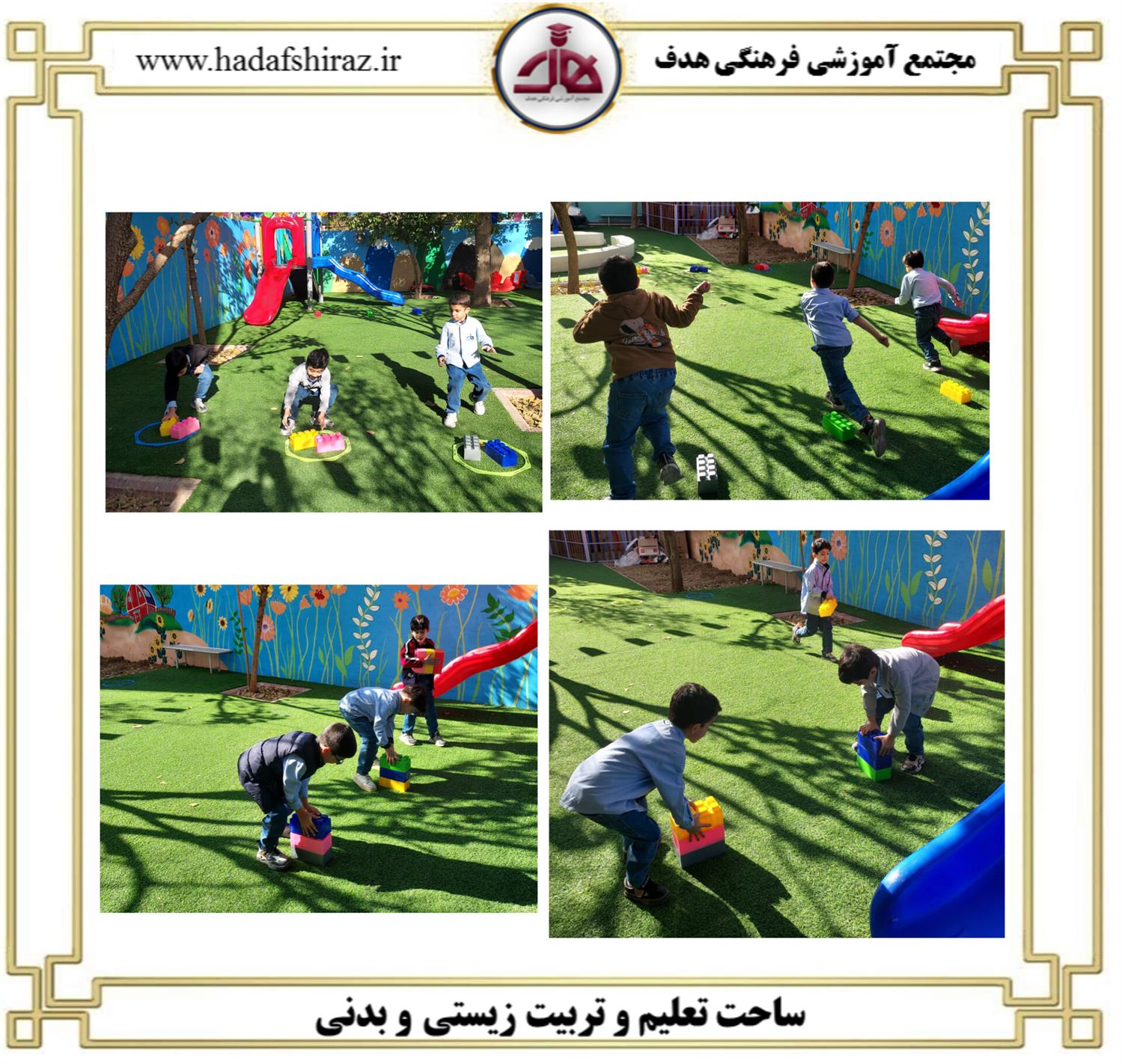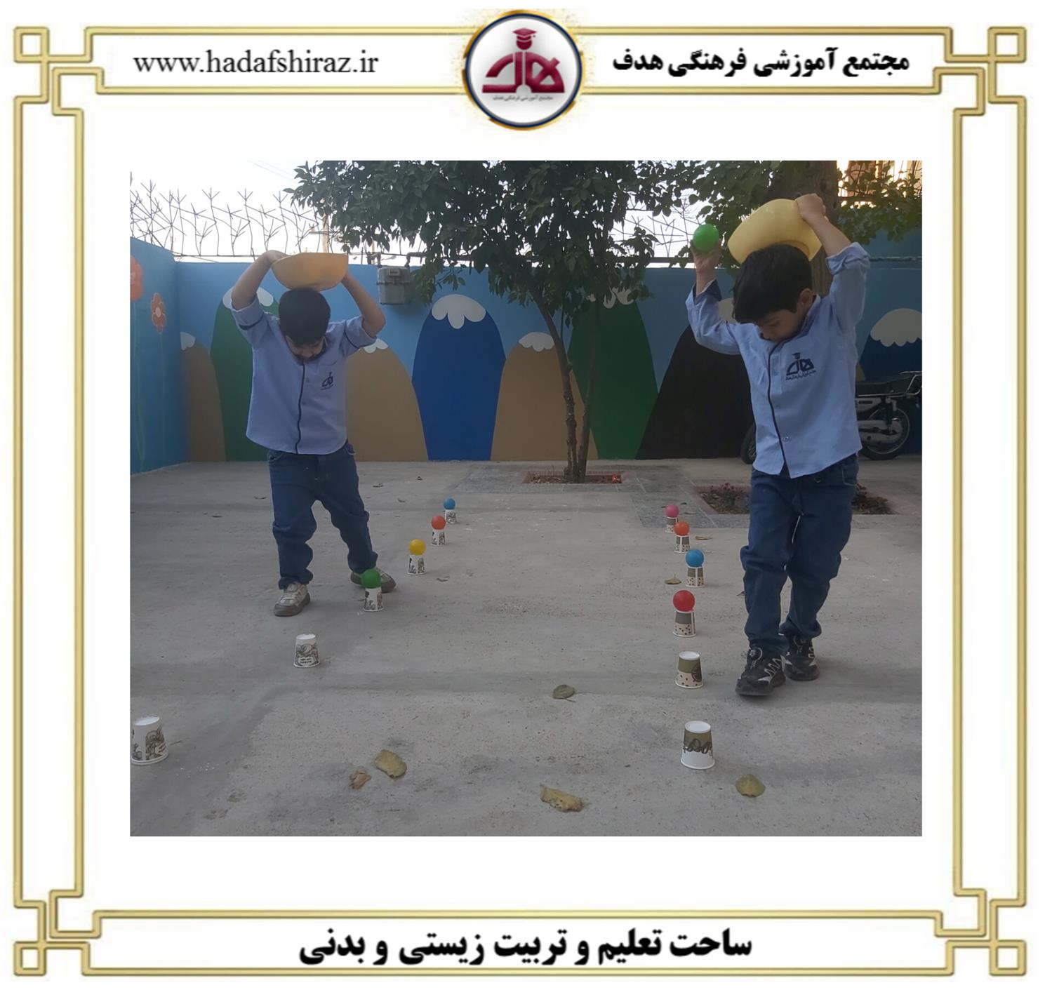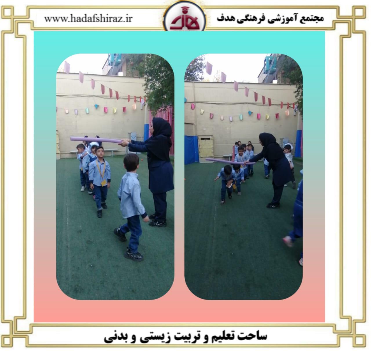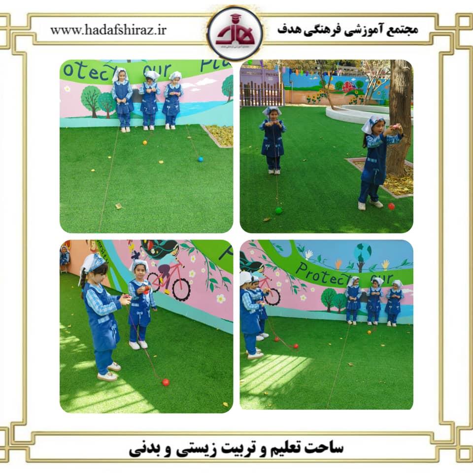 بازی رد شدن از روی موانع و عبور مارپیچ و پریدن در حلقه و پرتاب توپ جهت تقویت عضلات درشت و افزایش هماهنگی اعضای بدن