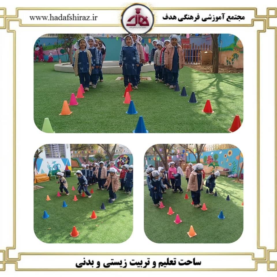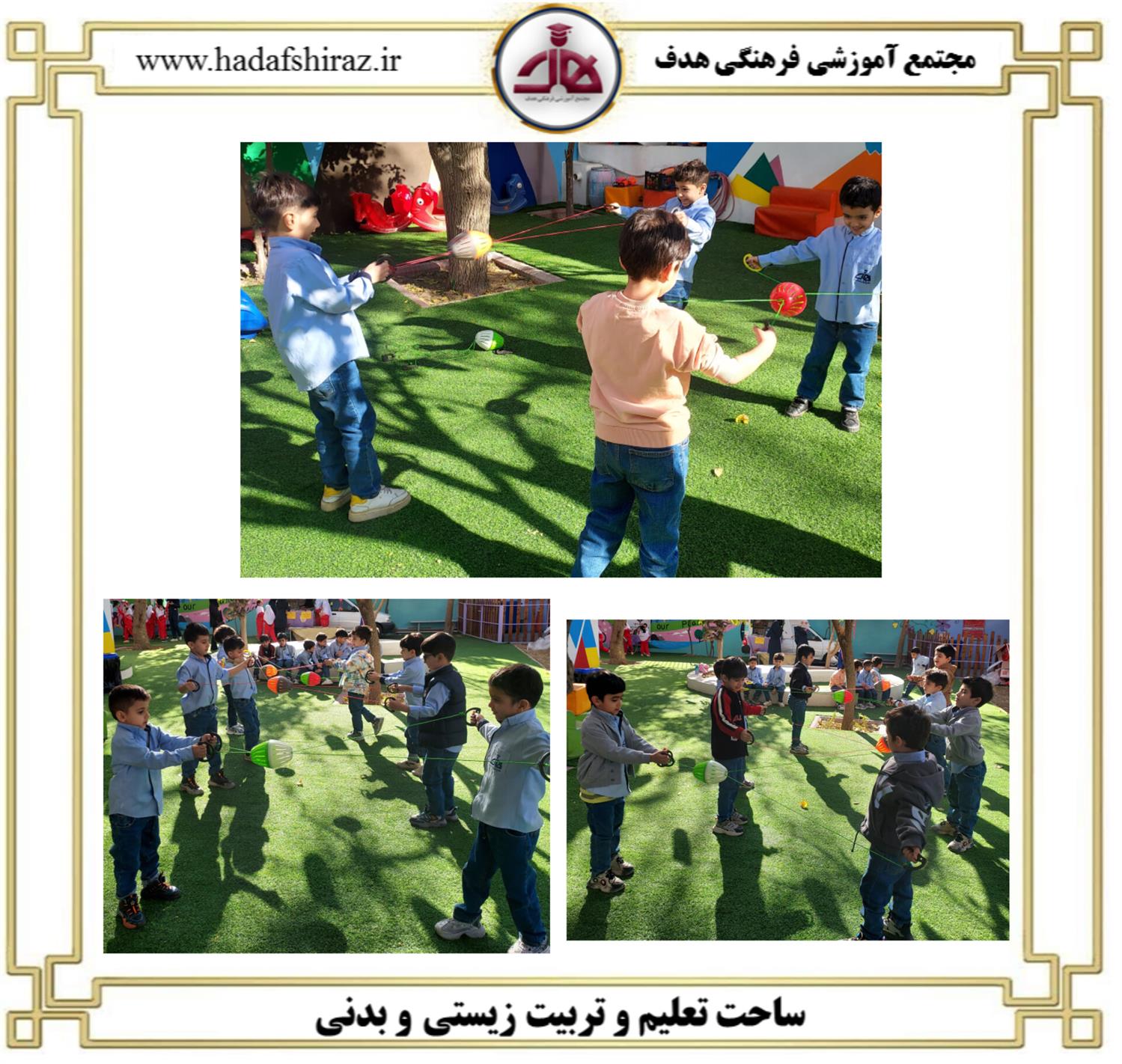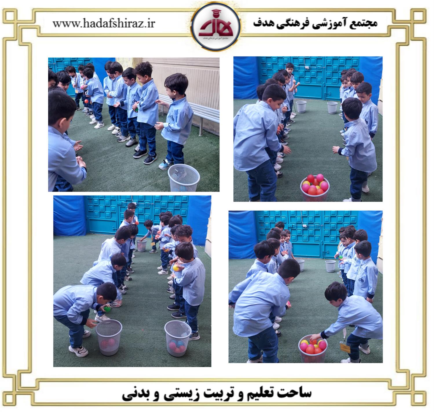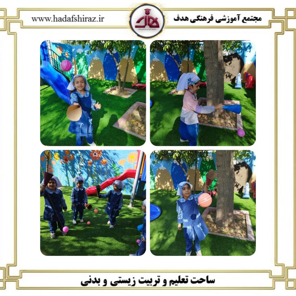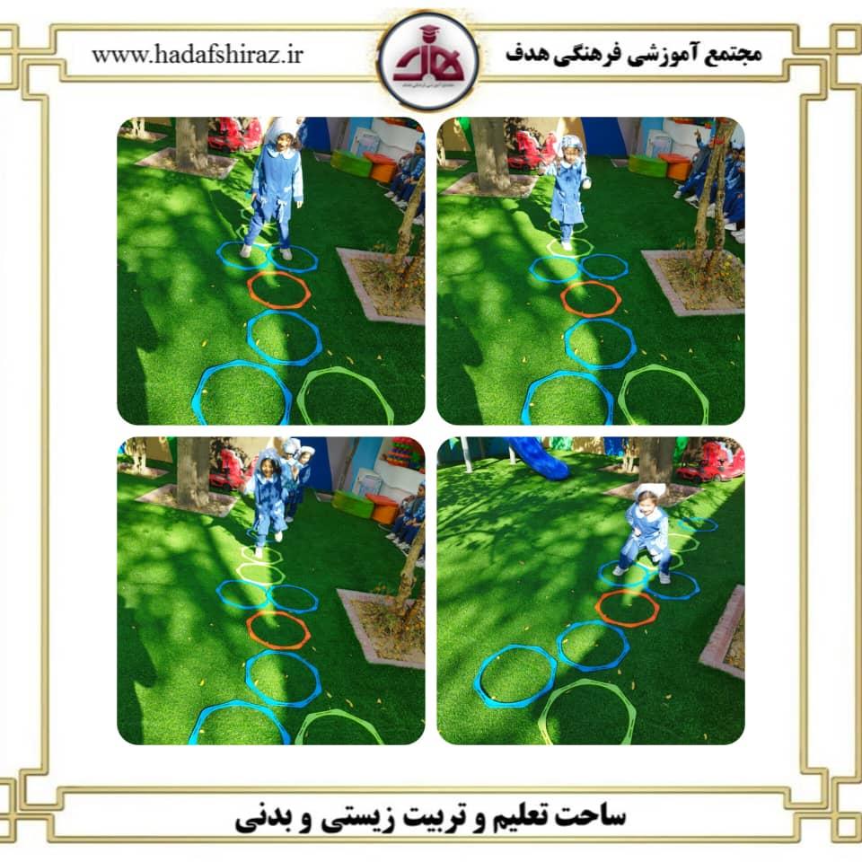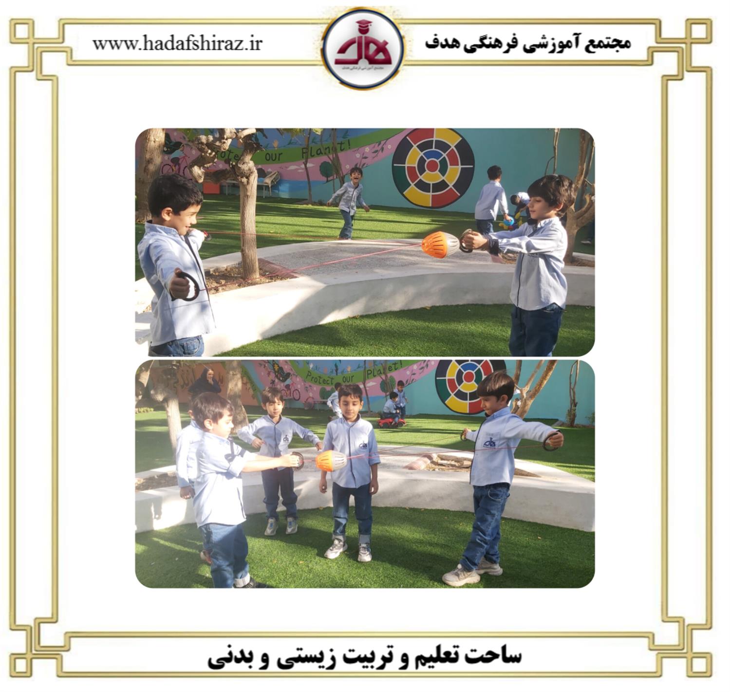 بازی رد شدن از روی موانع و عبور مارپیچ و پریدن در حلقه و پرتاب توپ جهت تقویت عضلات درشت و افزایش هماهنگی اعضای بدن