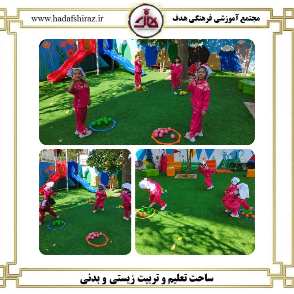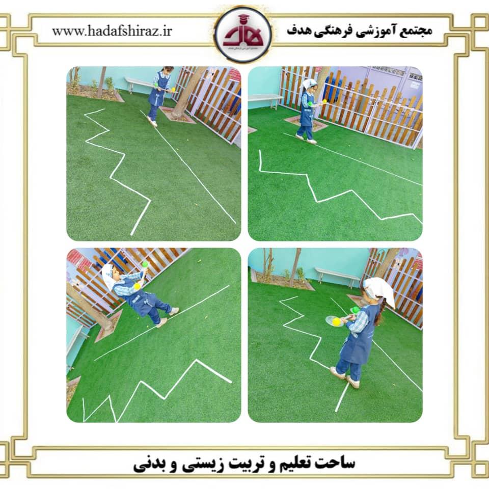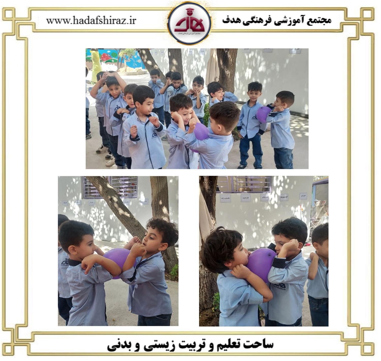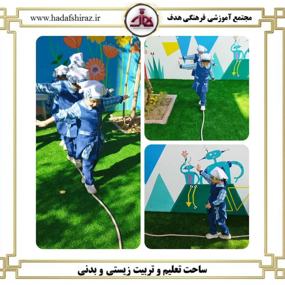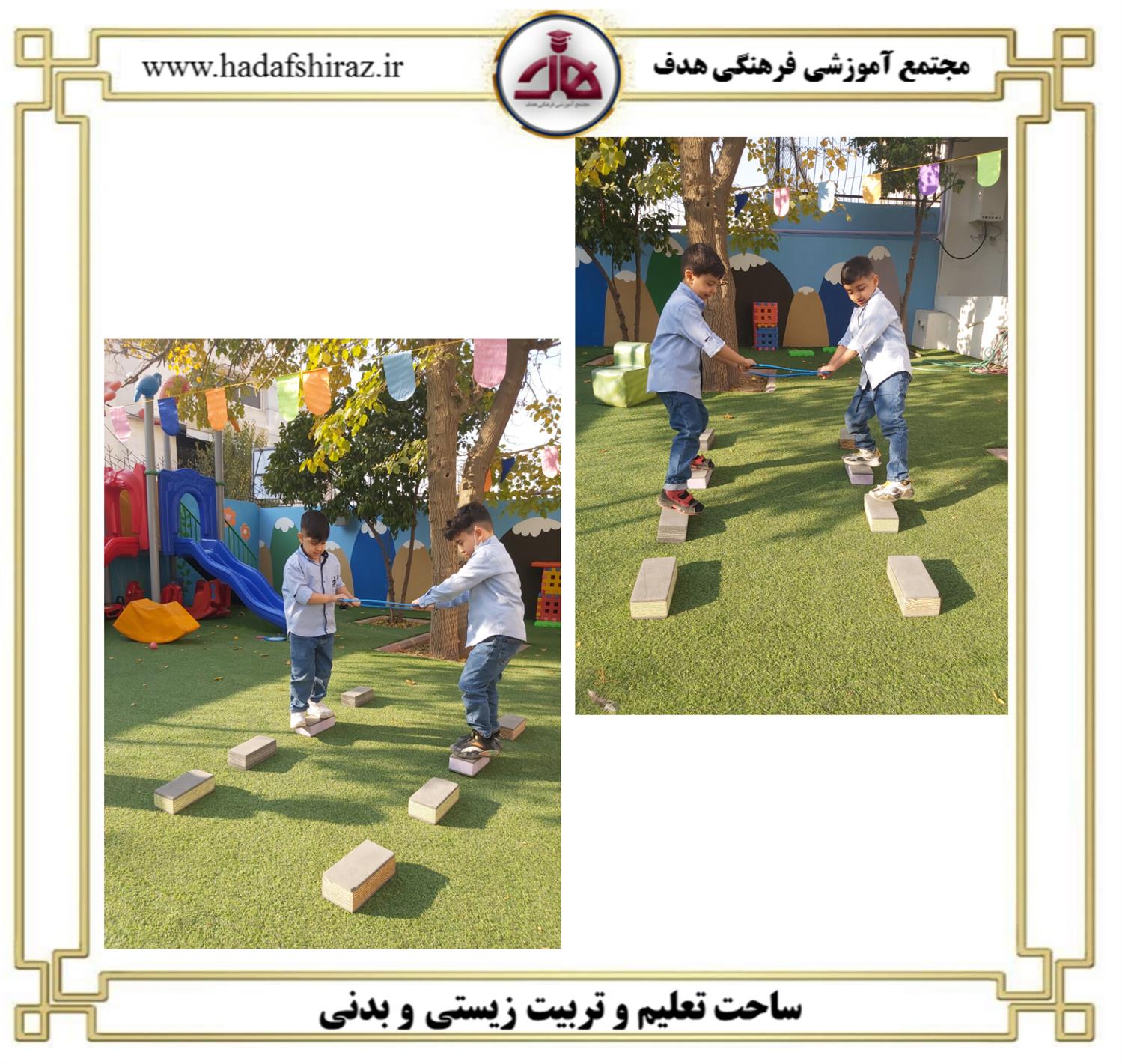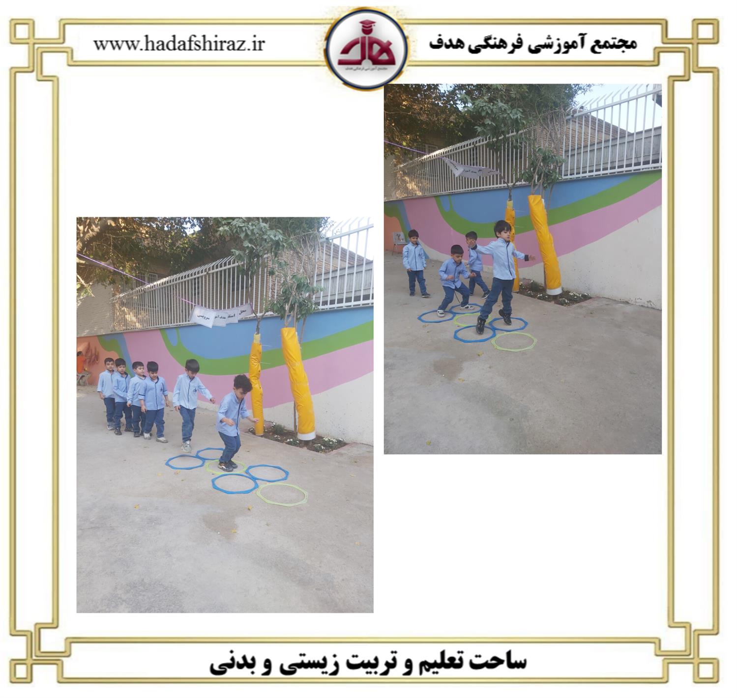 بازی رد شدن از روی موانع و عبور مارپیچ و پریدن در حلقه و پرتاب توپ جهت تقویت عضلات درشت و افزایش هماهنگی اعضای بدن