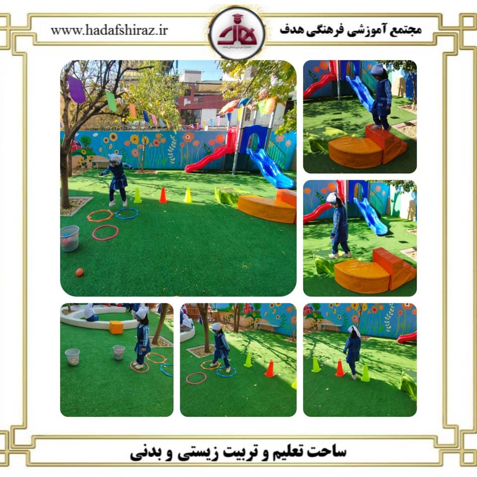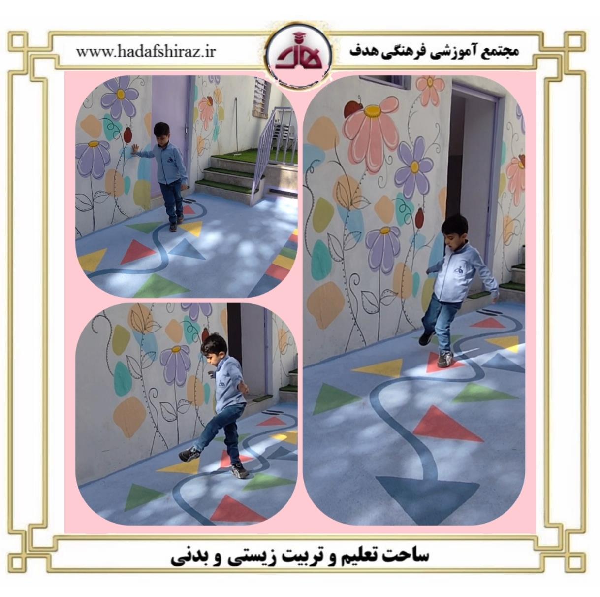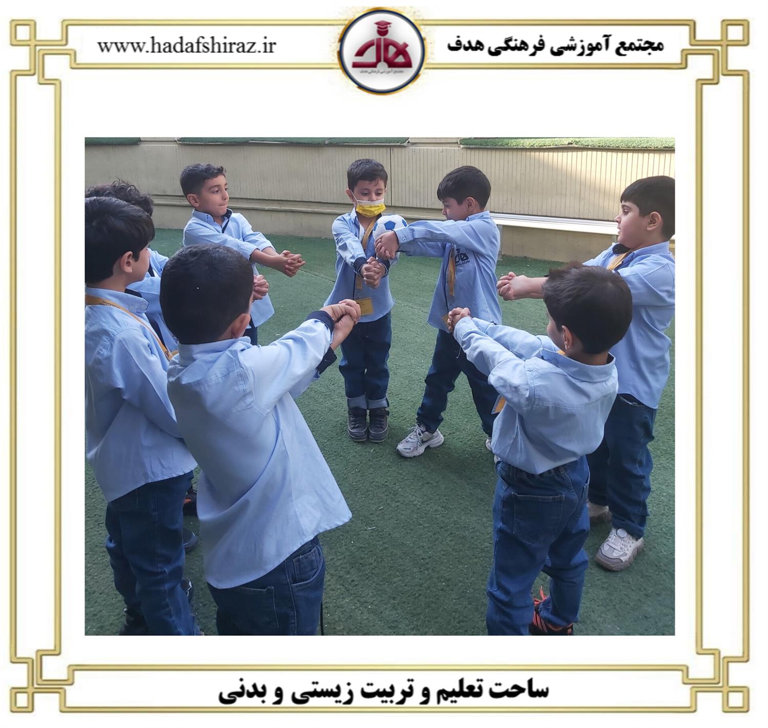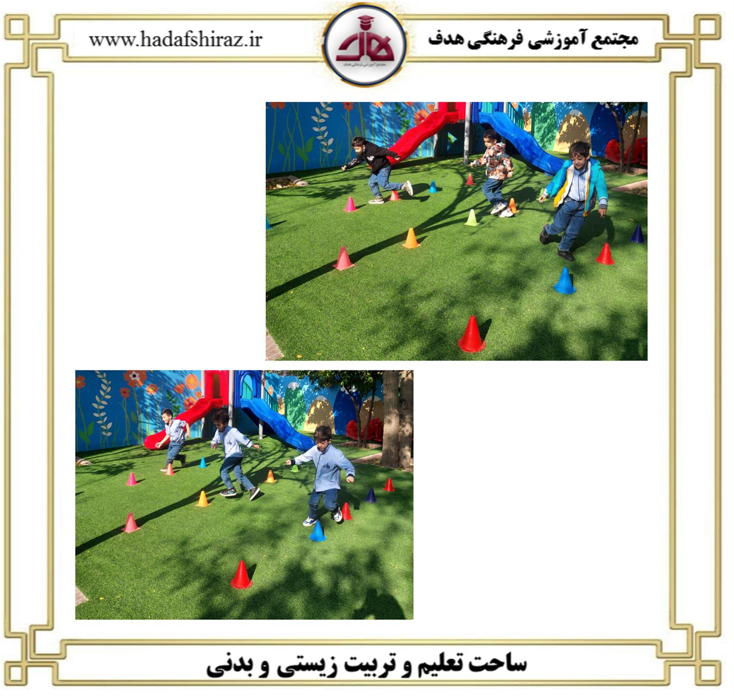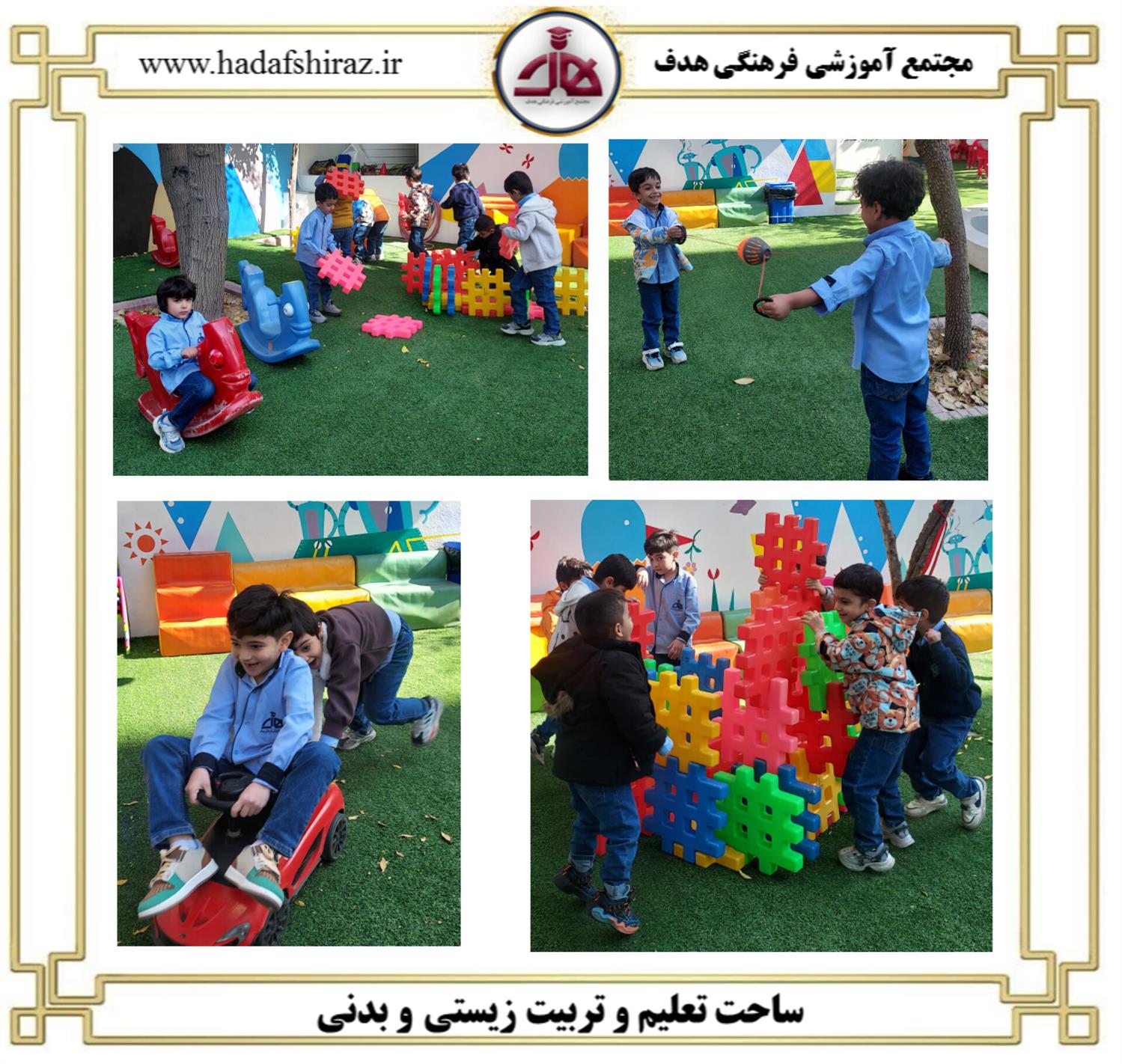 بازی رد شدن از روی موانع و عبور مارپیچ و پریدن در حلقه و پرتاب توپ جهت تقویت عضلات درشت و افزایش هماهنگی اعضای بدن